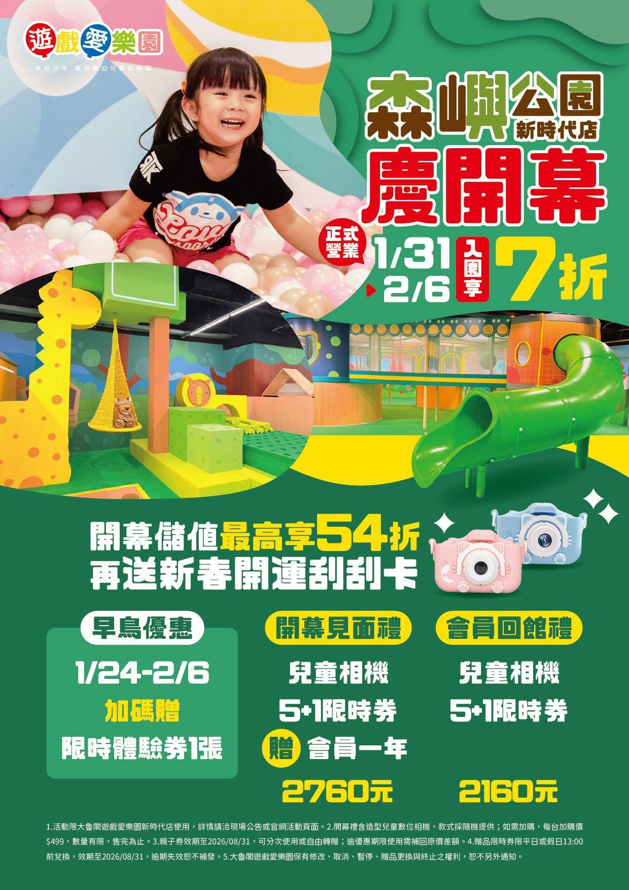 大魯閣遊戲愛樂園《森嶼公園 新時代店》全新登場 城市裡的一座小森林,邀請孩子一起探索 提早預約 https://forms.gle/EYucNRtFeZEKJSnu5 1/31(六)-2/6(五)首波開幕限定優惠 入園門票 限時 7 折 表單預約只要$406(名額有限) 開幕限定|三大亮點一次玩 會員回館專屬禮 會員回館即贈 手作禮品袋(限定會員憑簡訊、APP兌換) 入會・套票・手作課卡 早鳥優惠 新會員入會套票優惠 會員回饋套票方案 手作課程卡限時加碼 魔法史萊姆大泡泡秀 1/31–2/1、2/7–2/8 每日 15:00 讓孩子走進夢幻泡泡森林 (體驗價 $200/$699) ------ 第二波(1/31–2/28) 套票回館禮 持套票回館即贈 童玩體驗 30 分鐘 揪伴同玩優惠 2/7–2/28 入館即贈 第二人半價券 (限新時代店使用,效期至 3/31) 手作加碼回饋 手作不限金額消費 即贈 回館 $100 折價券 (消費滿 $500 可折抵 1 張)